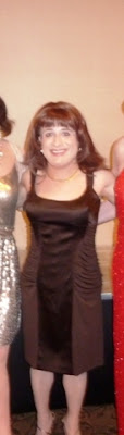 After the shopping trip, I went back to my room to change for the evening Gala. I wore a brown dress with a rounded, low cut neckline and shoulder straps, with side gathers (at least, I think that's what they are). I had worn it to the TGEA Holiday Gala, but this time I had the corset on underneath. Let me tell you, there is quite a difference. I have sent photos of both to Meg. Hopefully she is able to post them here for comparison. I was wearing my long red wig, which I seem to enjoy wearing to more formal events. And I paired the dress with some 3 1/2 inch strappy sandals by Chinese Laundry, which are more of a rust color, but close enough. The heels are not the most comfortable to wear, but they look great and make me taller. The things we girls do for fashion.